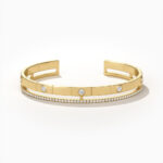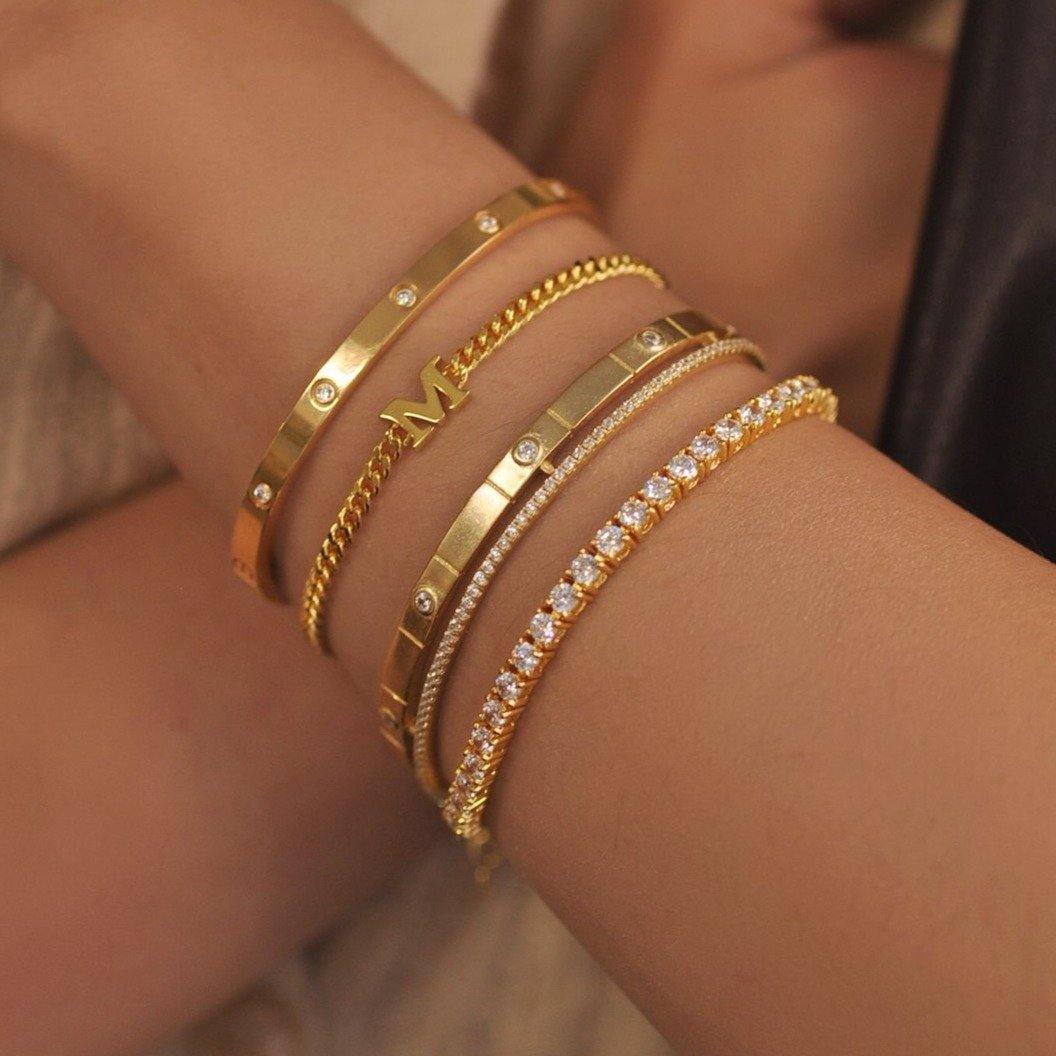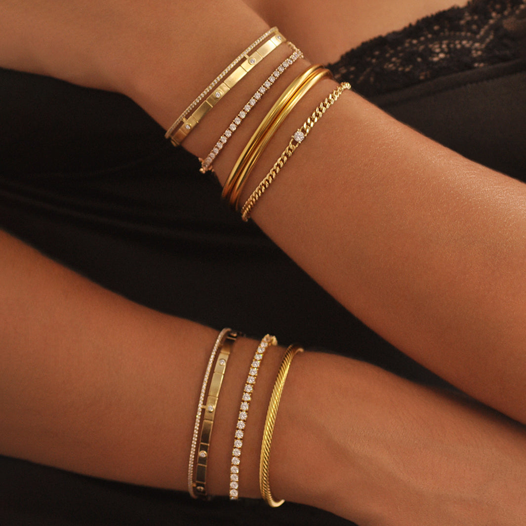 The Amore bracelet is a delicate piece for everyday wear. The open bangle features 5 round CZ stones and a row of shimmering fine crystals.