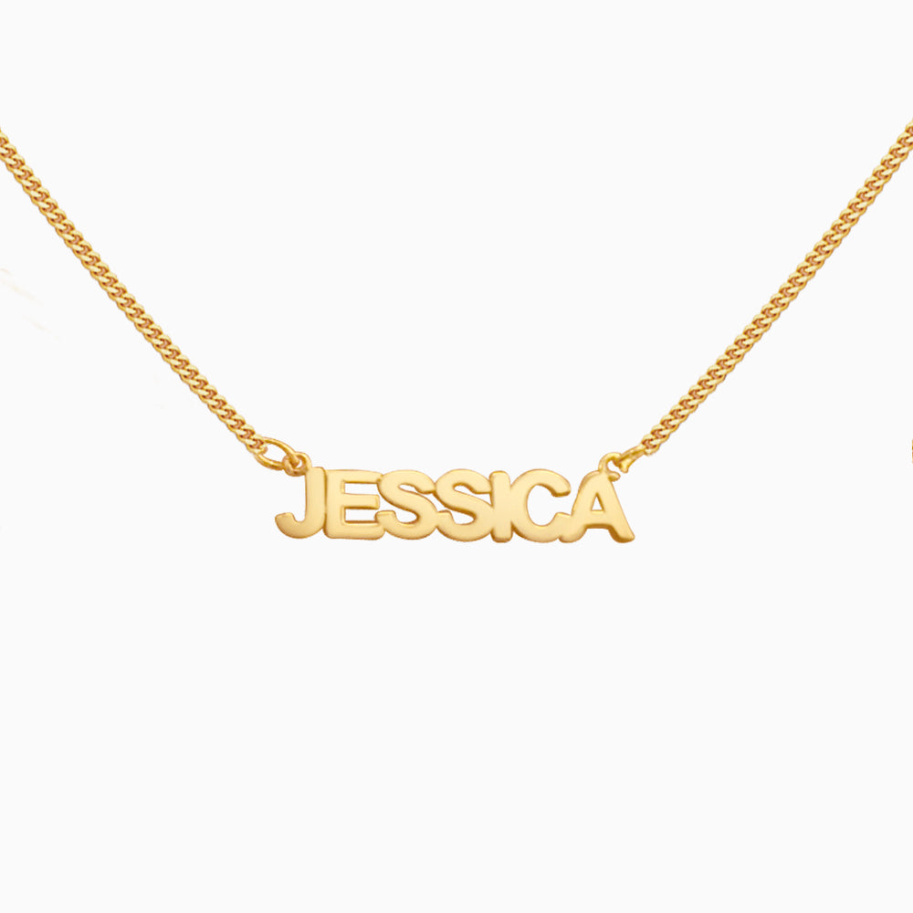Create your own personalized nameplate necklace, featuring a gold uppercase block letter nameplate that sits on a fine curb chain.