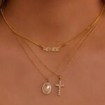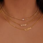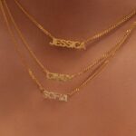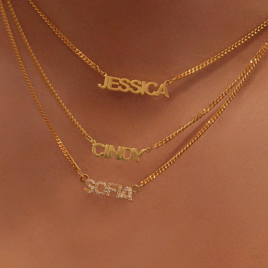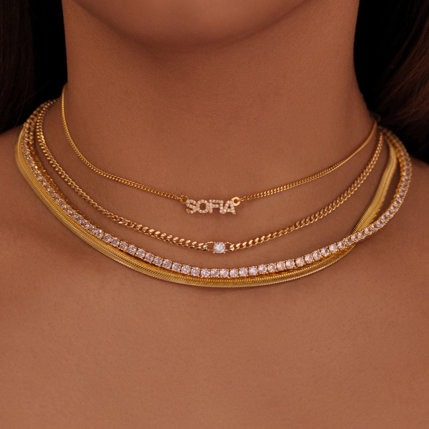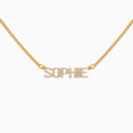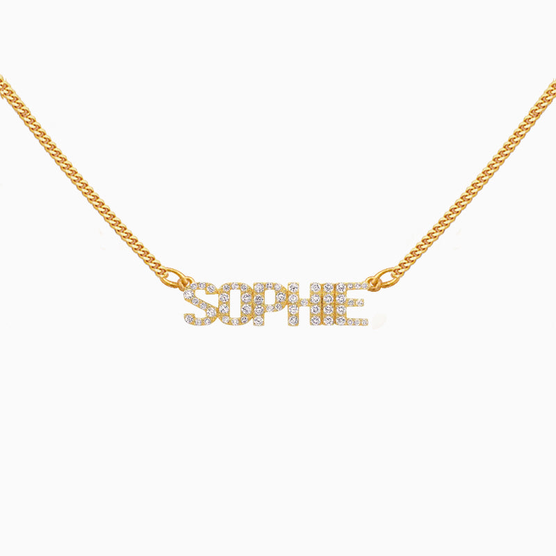 Create your own personalized pave nameplate choker necklace, featuring sparkling CZ crystals in uppercase block letter nameplate that sits on a fine curb chain.