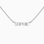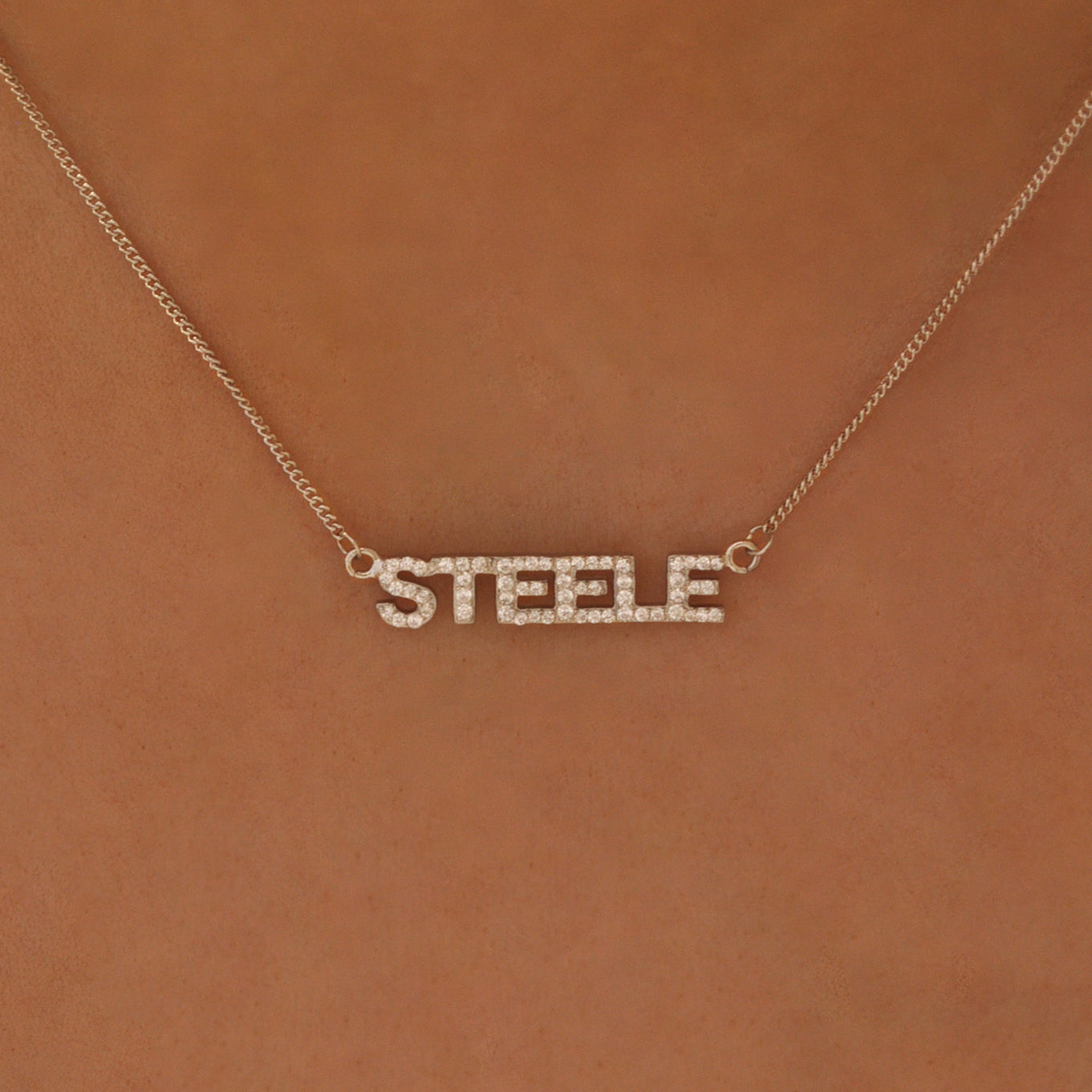Create your own personalized silver pave nameplate choker necklace, featuring sparkling CZ crystals in uppercase block letter nameplate that sits on a fine curb chain.